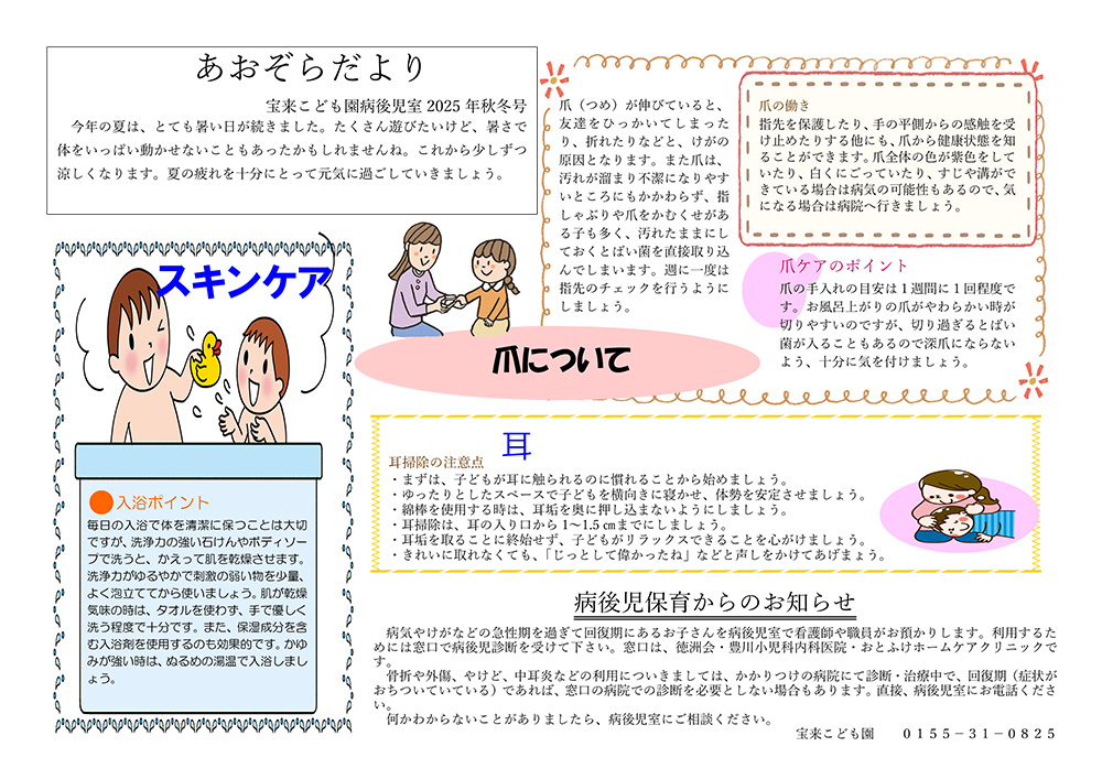 病気やけがなどが急性期を過ぎて回復期にあるお子さんを、専用の病後児保育室で専任の看護師・保育士がお預かりをします。その子の生活リズム、体調、症状に合わせて、ゆったりと過ごすことで無理なく体力を回復していきます。成長期のお子さんの「からだ」も「こころ」も丸ごとみていくために、看護師と保育士の専門性を合わせて、保育看護をしていきます。