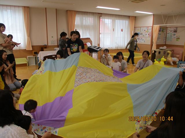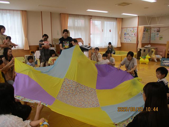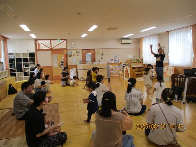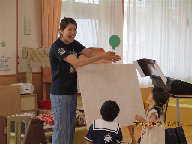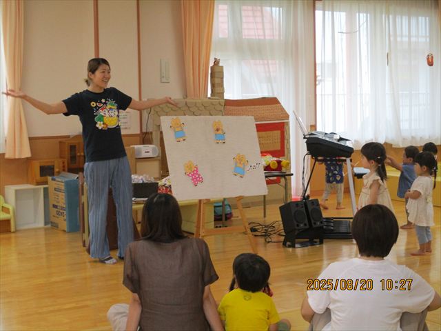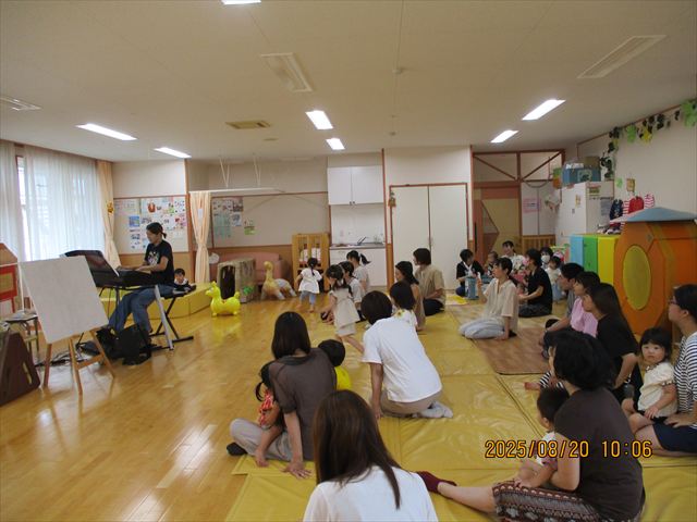 楽しい音楽の時間を提供してくださったのは、ミュージック音楽教室の坂本栄さんでした。 先生の演奏から始まり、親子で歌遊びやパネルシアター、体を動かし踊ったりと盛りだくさんの内容に笑顔がいっぱいの音楽の時間でした♪