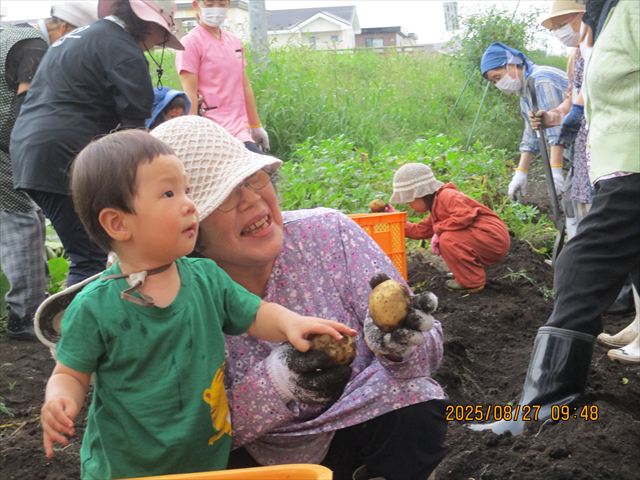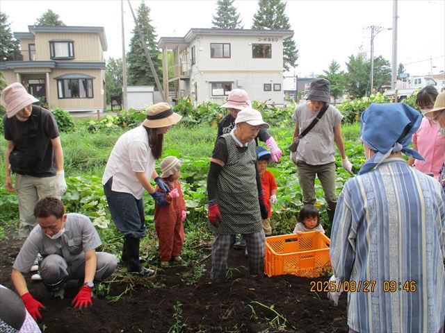 春に、地域農園「ことの葉」で植えたおいもが大きくなり、今日はことの葉さんの方々、地域のボランティアさんと一緒に収穫しました。