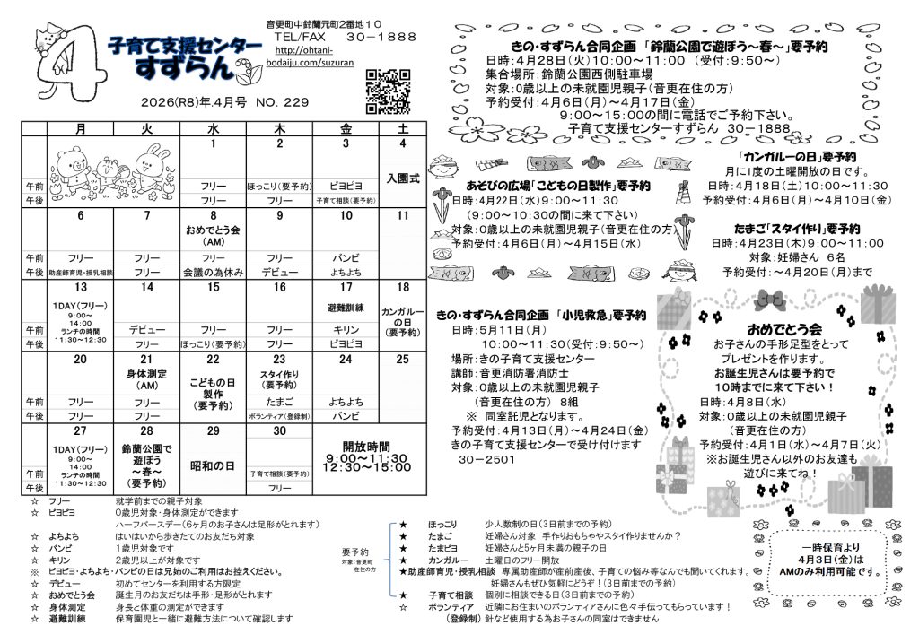 子育て支援センターすずらんINFO 鈴蘭保育園 子育て支援センターすずらん 子育て支援センター4月の予定表を更新しました 子育て支援センター4月の予定表を更新しました カテゴリー 子育て支援センターすずらん 投稿者 作成者: sysadmin 投稿日 2026年3月16日 子育て支援センターすずらんの2026年4月の予定表を更新しました。あそびの広場や一般開放の日程などはこちらからご確認ください。 子育て支援センターすずらん ← 前:卒園児 お別れ会
