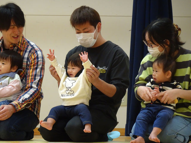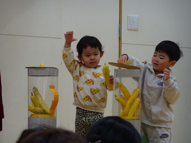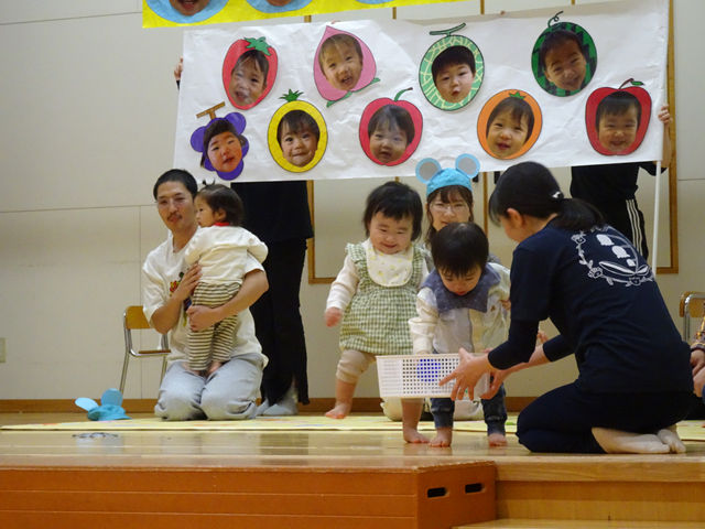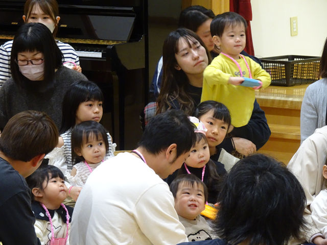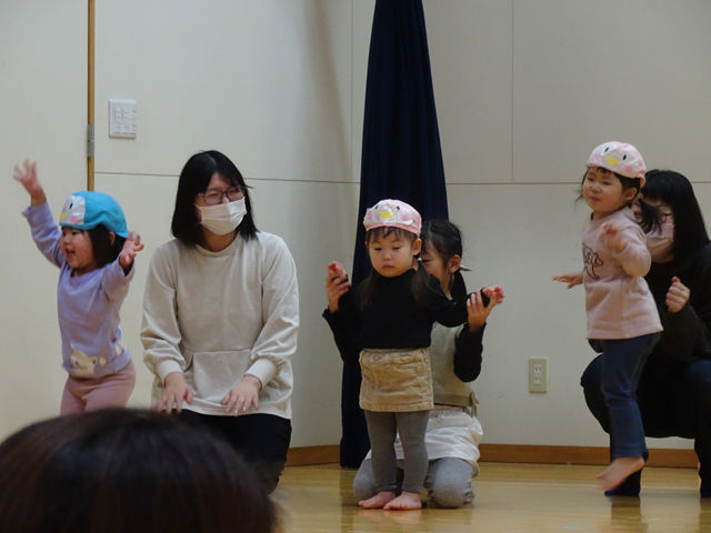 0,1,2歳児の子ども達は、大きいクラスの劇遊びや歌、ベルや太鼓、よさこいの様子をお遊戯場でたくさん見てきました。ピアノの音や太鼓の音が聞こえると集まってきては見て真似て楽しんでいましたよ。その中で、なんだか自然と体が動いてしまう様な楽しさを日々重ねてきたのだと思います。次は、自分たちがお兄さんやお姉さん達に素敵なステージを見てもらう番です。「かわいい」「じょうず」と沢山拍手をもらって過ごしてきました。