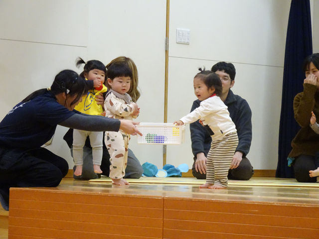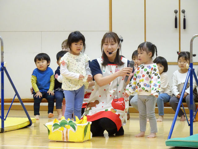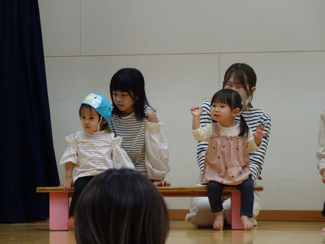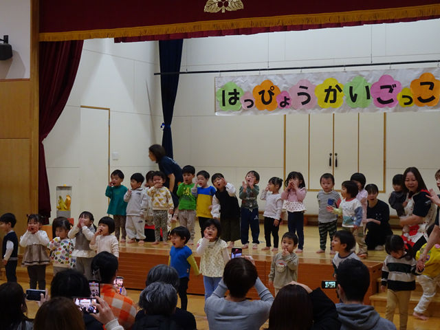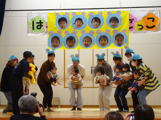 そして11月29日土曜日、はっぴょうかいごっこを開催する日がやってきました。ステージから見える景色はいつもと違った様です。緊張した表情でジーっと見つめていたり、保護者を見つけて手を振ったりしていました。いつもと違う事をしっかり感じながらも、一人ひとりが自分らしい表現遊びを見せてくれました。0,1歳児は保護者と一緒にステージに上がり、2歳児さんは子ども達だけでステージに立つ事が出来ました。どんな表情も、どんな動きもかわいらしさがあふれ、見ている人たちまでも笑顔になる発表でした。保護者の皆様の温かいまなざし、沢山の拍手ありがとうございました。