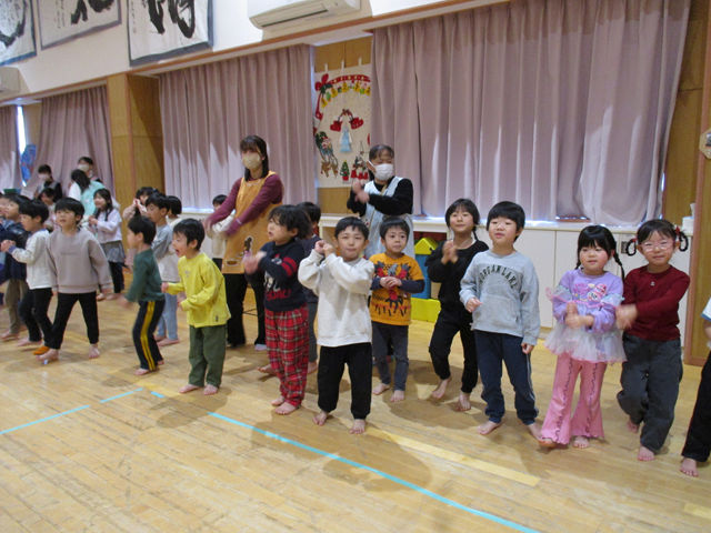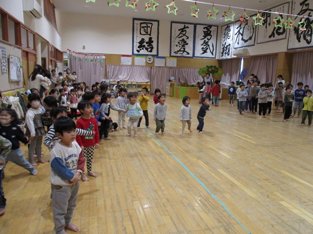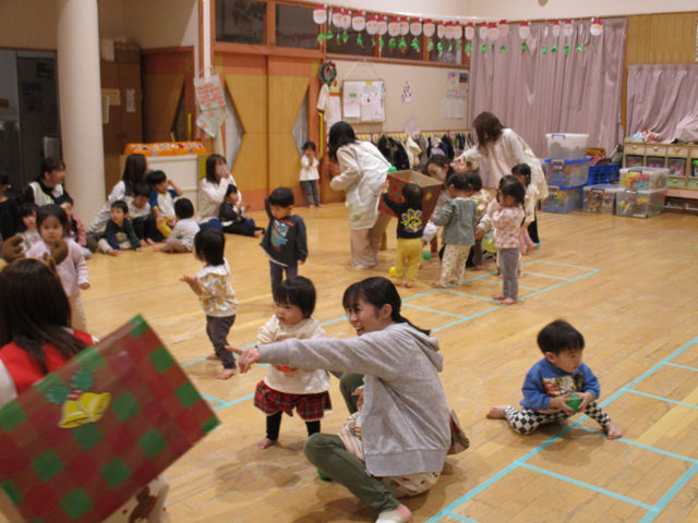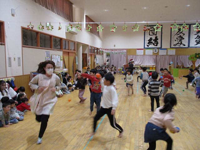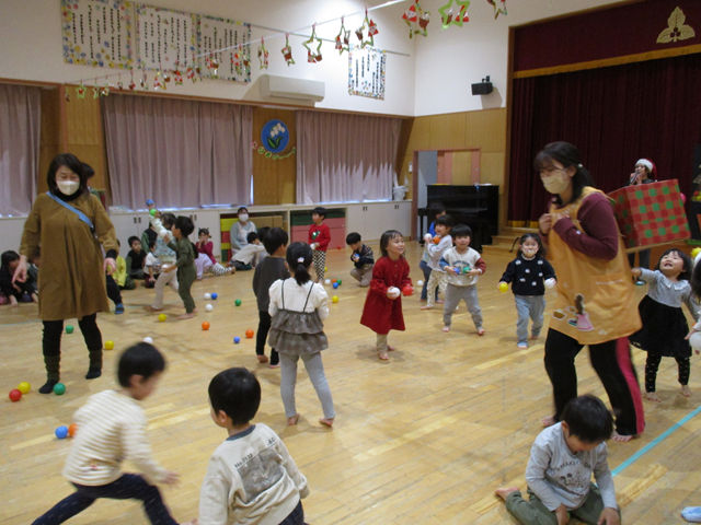 そして、12月19日金曜日は待ちに待っていたクリスマス会です。サンタさんが遠くからでも見える様に大きなツリーを作ろうと追っかけ玉入れをして、全クラスで玉を集めて素敵なツリーを作りましたよ。サンタさんが登場すると「わー」っと歓声が上がり、サンタさんに「玩具はどこから持ってくるの?」「サンタさんは何歳?」「夏の間何してるの?」と質問もしました。一緒に踊ったり、大きなプレゼントももらいました。サンタさんに「ありがとう」の気持ちも伝える事が出来ました。