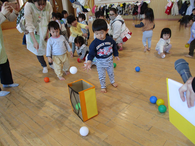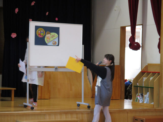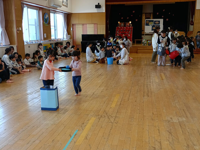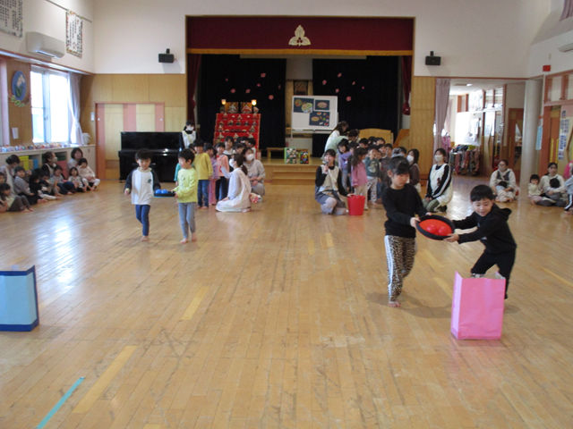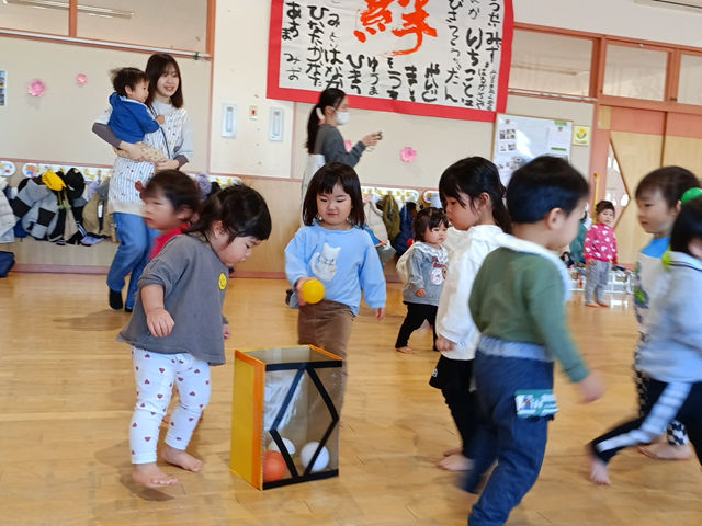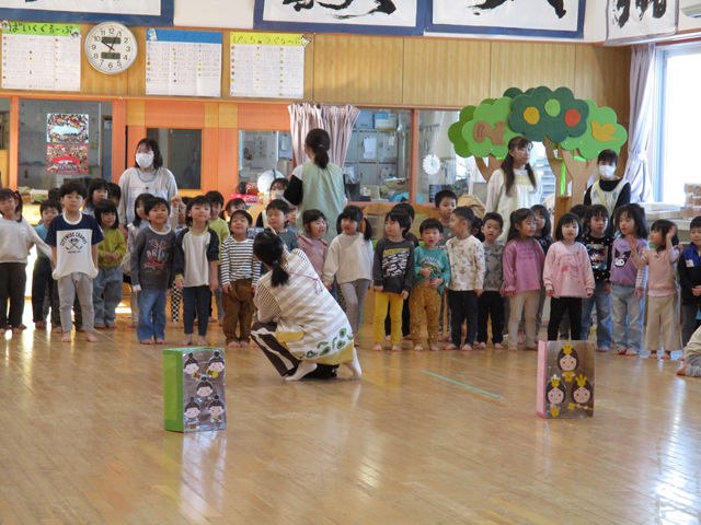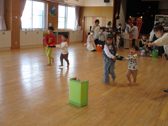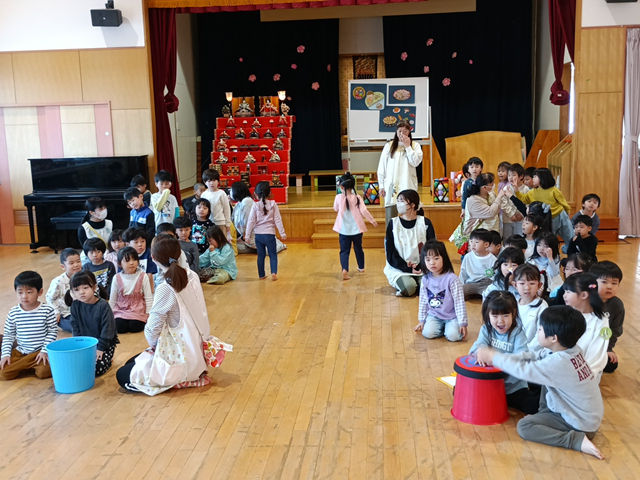 「きょうは たのしい ひなまつり」数日前からお遊戯場に飾られたお雛様の前には子ども達があつまり、ひな人形やお道具を眺めて、絵本を片手におひなさまクイズをしている子ども達もいました。それぞれのクラスでは、自分たちでひな人形も作りました。そして3月3日を迎えひなまつり当日を迎えました。お遊戯場に全クラスが集合し、ひな人形の由来や、ちらし寿司の具材にもそれぞれ理由がある事も聞きました。その後は、ゲームをして楽しみました。給食には、ちらし寿司や澄まし汁を食べて健やかな成長を願い過ごしました。